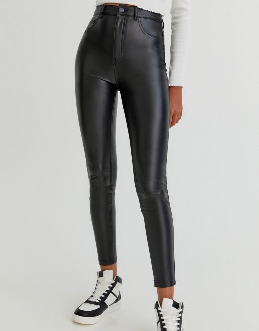 Pull&Bear – Eng geschnittene Hose aus Kunstleder in Schwarz