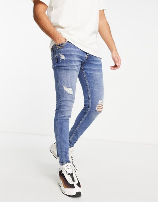 Pull&Bear – Eng geschnittene Premium-Jeans mit Rissen in Blau