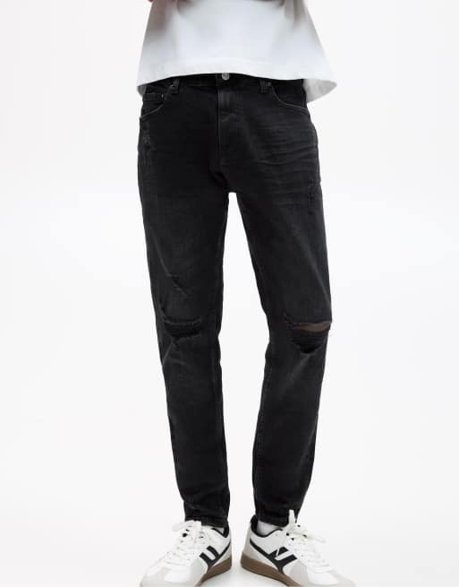 Pull&Bear – Enge Jeans in verblasstem Schwarz mit Zierrissen