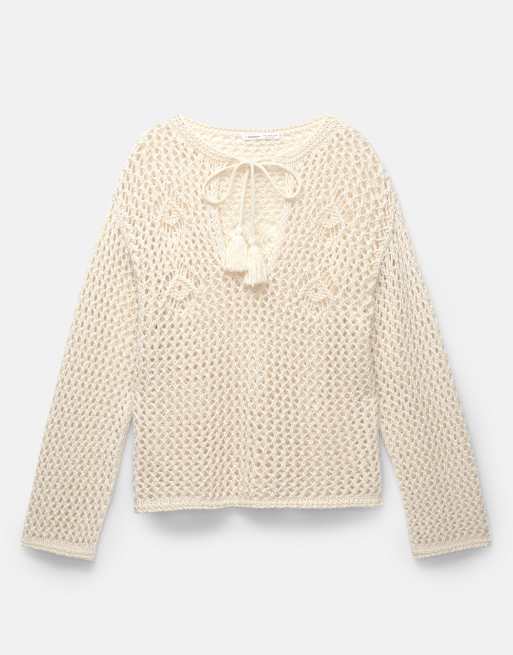 Pull&Bear – Gehäkelter Pullover in Beige mit Kordelzug