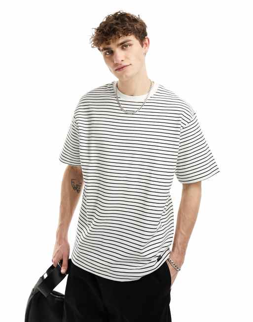 Pull&Bear – Gestreiftes T-Shirt in Weiß aus Ottoman-Gewebe