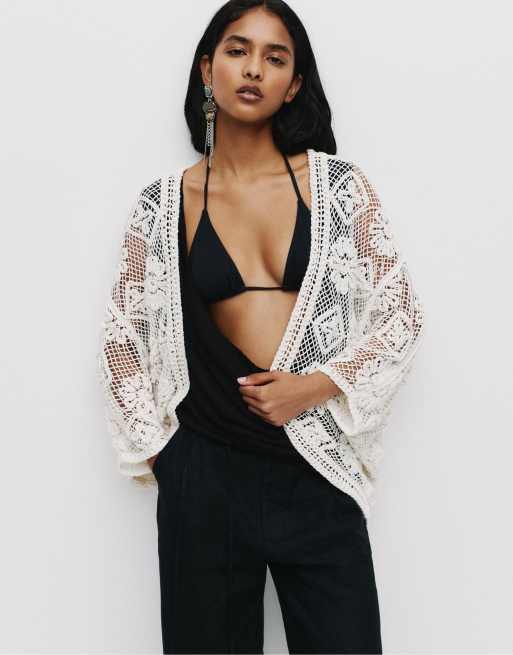 Pull&Bear – Häkel-Kimono in Beige mit Blumenmuster