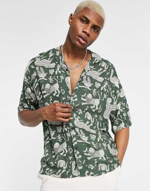 Pull&Bear – Hemd mit Tattoo-Print in Grün