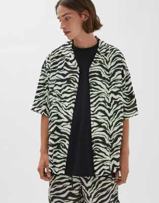 Pull&Bear – Hemd mit Tigermuster in Schwarz-Weiß
