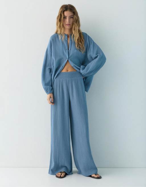 Pull&Bear – Hose aus fließendem Chiffon in bläulichem Farbton