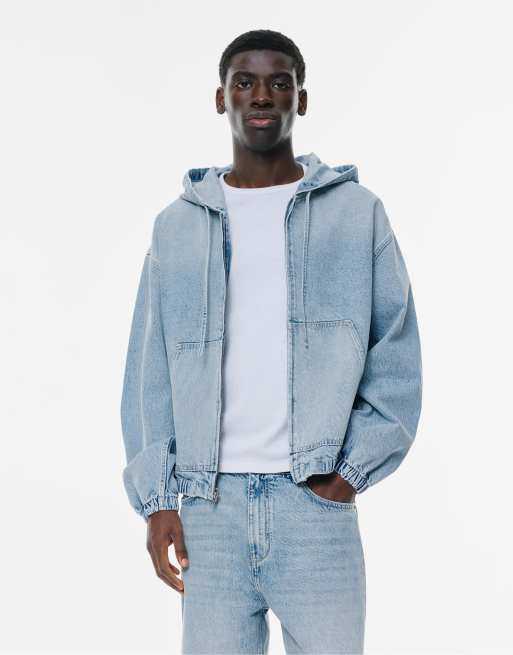 Pull&Bear – Jeansjacke in blassem Indigoblau mit Kapuze