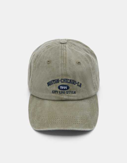 Pull&Bear – Kappe in verblasstem Grün mit „Boston“-Stickerei