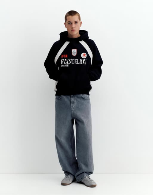 Pull&Bear – Kapuzenpullover in Schwarz mit „Evangelion“-Print