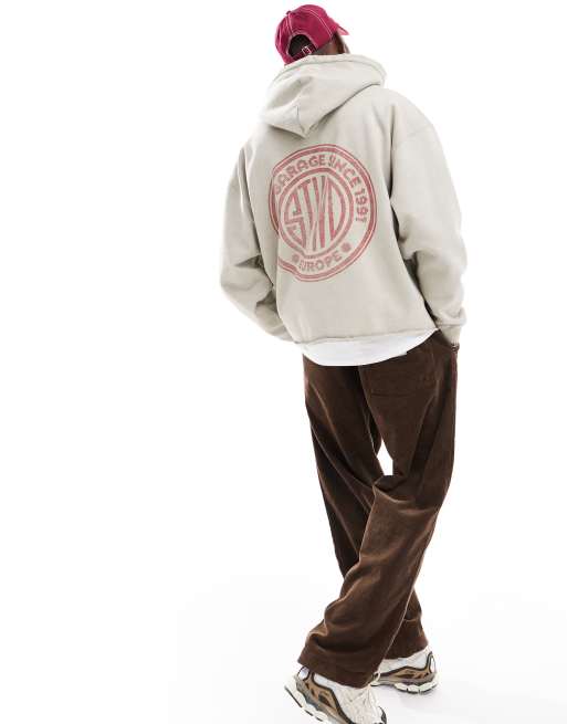 Pull&Bear – Kapuzenpullover in verwaschenem Grau mit unversäubertem Saum und „STWD“-Garagenprint