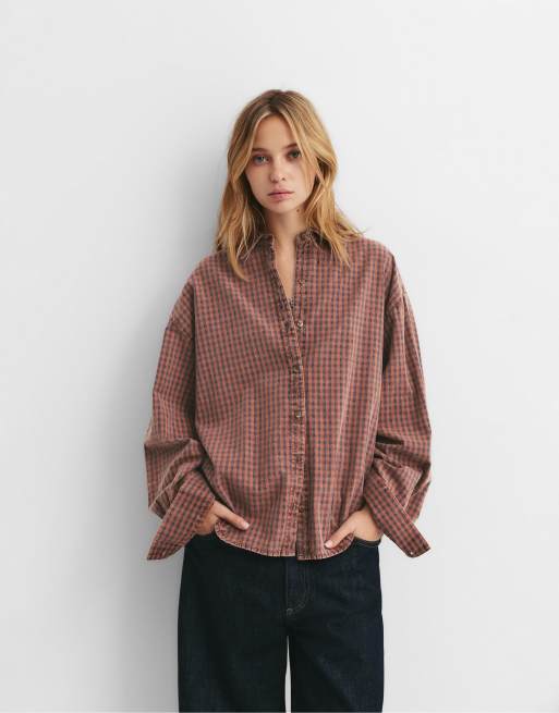 Pull&Bear – Karierte Hemdbluse in Lehmton mit Lack-Optik