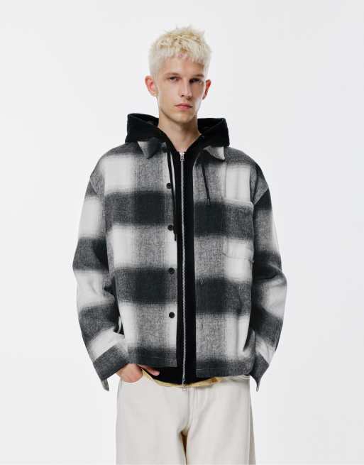Pull&Bear – Karierte Hemdjacke in Schwarz mit Brusttasche