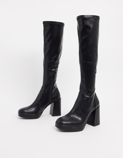 Pull&Bear – Kniehohe Stiefel in Schwarz mit Plateauabsatz