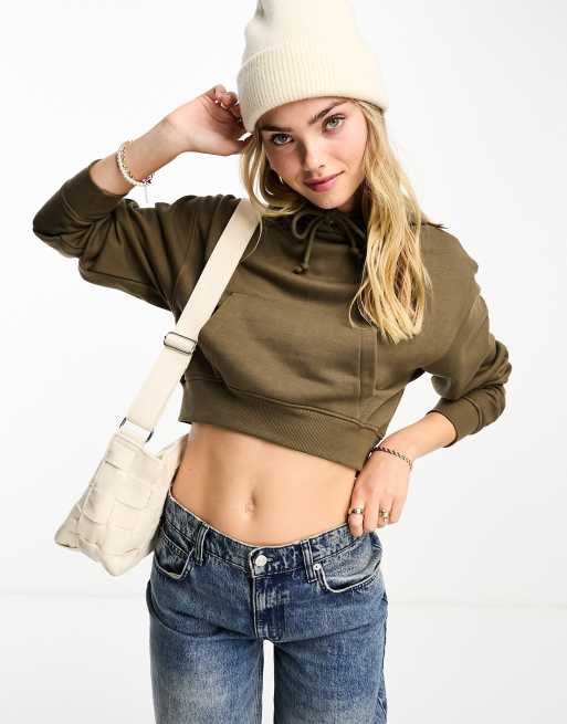 Pull&Bear – Kurz geschnittener Kapuzenpullover in Khaki mit Tunnelzug