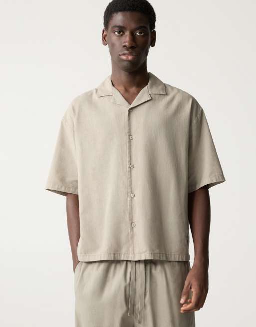 Pull&Bear – Kurzärmliges Hemd aus Leinenmix in Ocker