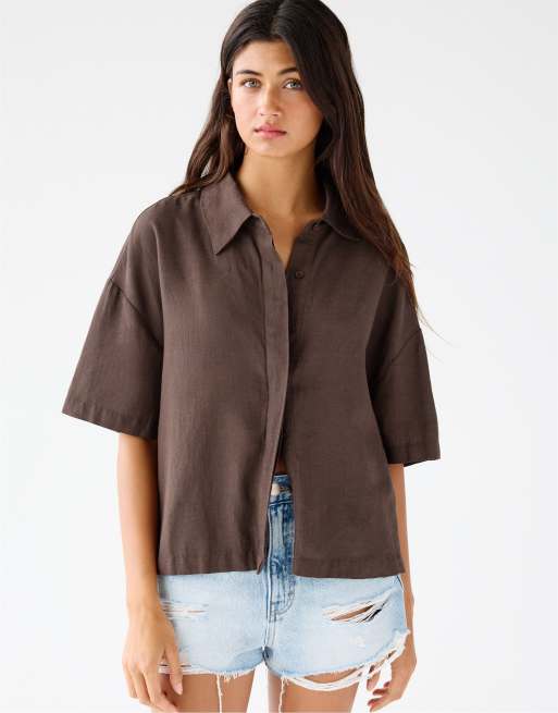 Pull&Bear – Kurzärmliges, rustikales Hemd in Braun