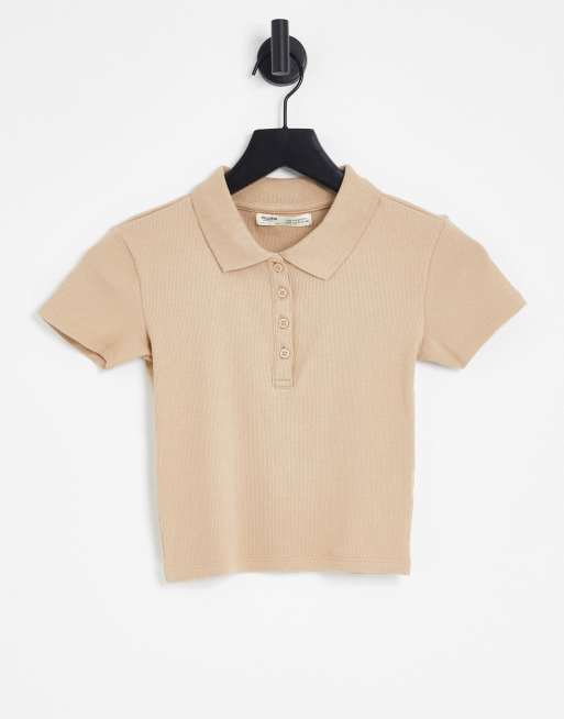 Pull&Bear – Kurzes T-Shirt mit Polokragen in Stein
