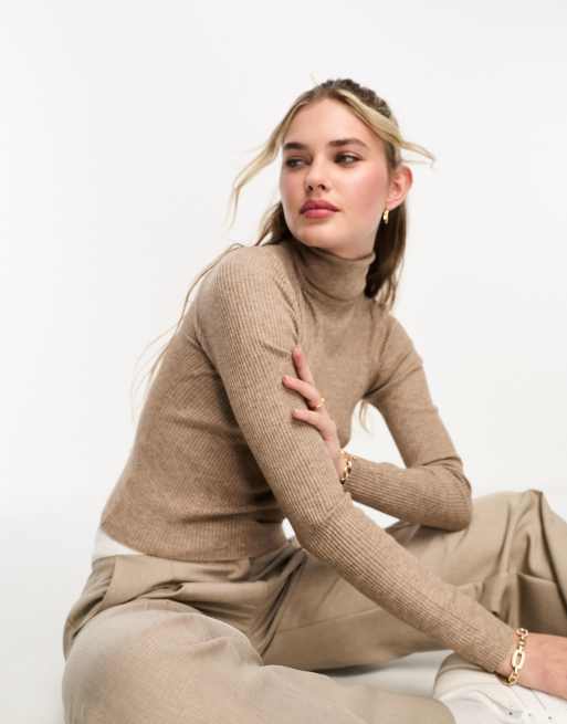 Pull&Bear – Langärmliger Strickpullover in Hellbraun mit Polokragen
