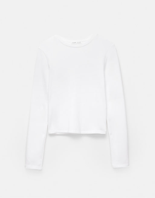 Pull&Bear – Langärmliges, figurbetontes T-Shirt in Weiß