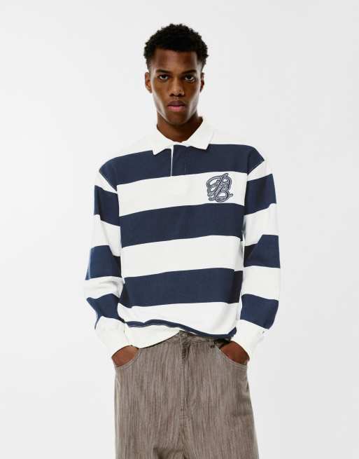 Pull&Bear – Langärmliges, gestreiftes Poloshirt in Marineblau