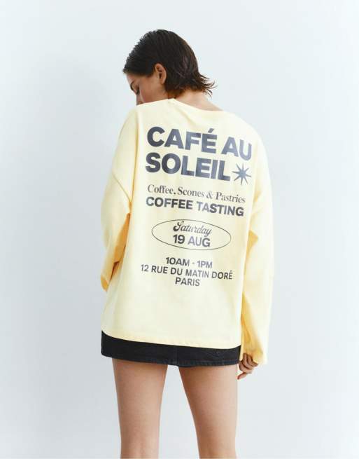 Pull&Bear – Langärmliges T-Shirt in Gelb mit Schriftzug