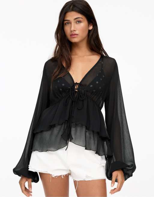 Pull&Bear – Lockere Bluse in Schwarz mit Rüschen