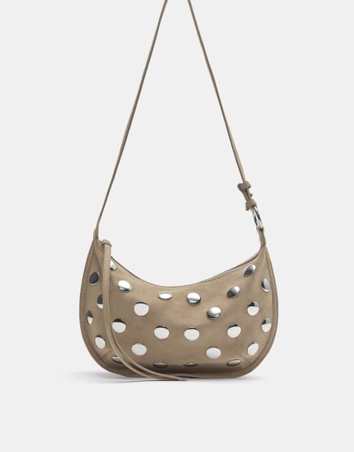 Pull&Bear – Mit Nieten besetzte Umhängetasche in Grau/Kamelbraun