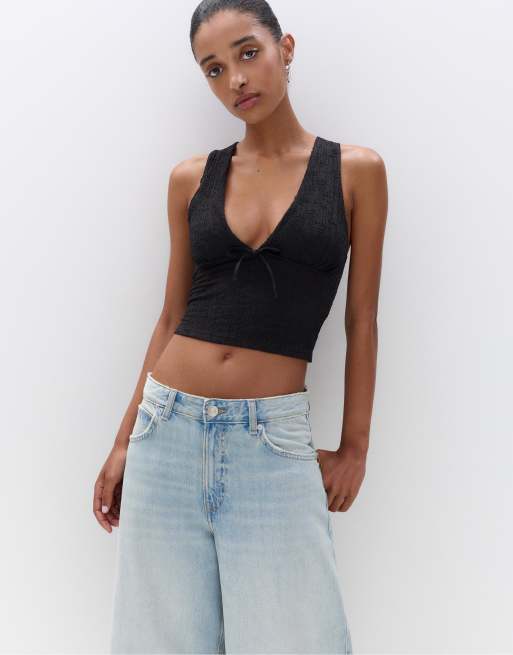 Pull&Bear – Oberteil aus Kreppstoff in Schwarz mit Schleife