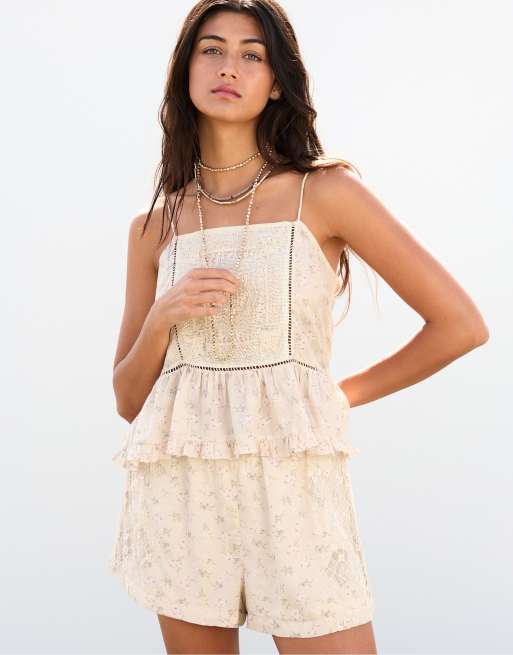 Pull&Bear – Oberteil in Beige mit Blumenstickerei