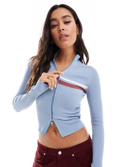 Pull&Bear – Pullover in geripptem Blau mit durchgehendem Reißverschluss und Streifendetail