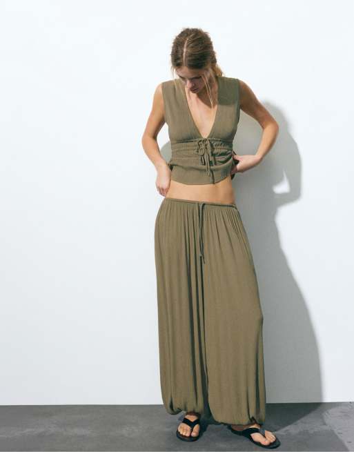 Pull&Bear – Sarouel – Hose aus Kreppstoff in Grün