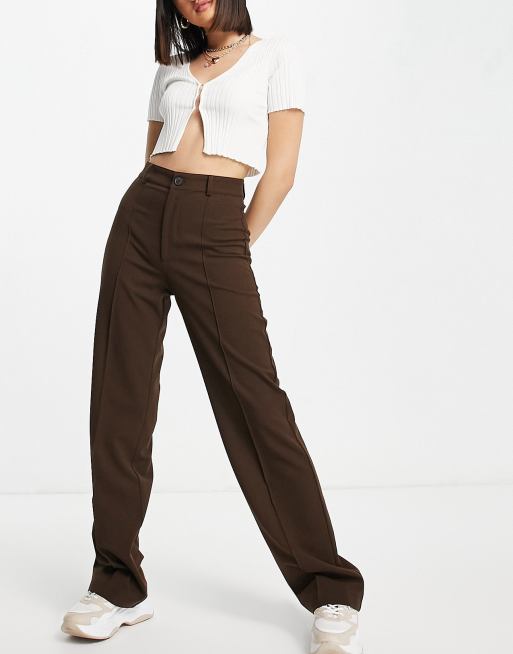 Pull&Bear – Schmal geschnittene, figurbetonte Hose in Braun mit hohem Bund, geradem Bein
