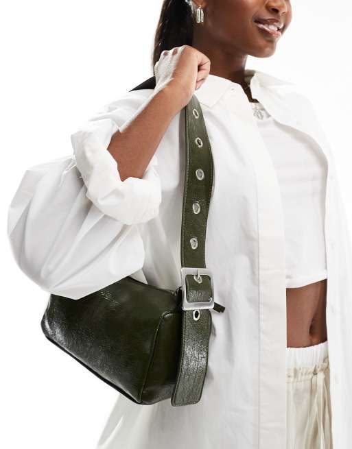Pull&Bear – Schultertasche in Khaki mit Knittereffekt