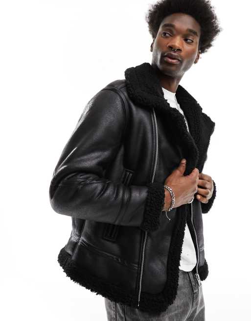 Pull&Bear – Schwarze Pilotenjacke aus Lederimitat mit Lammfellfutter