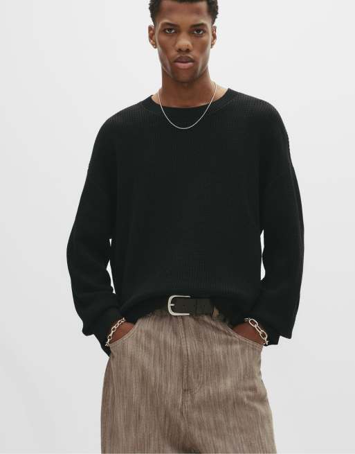 Pull&Bear – Strickpullover in Schwarz mit Waffelstruktur