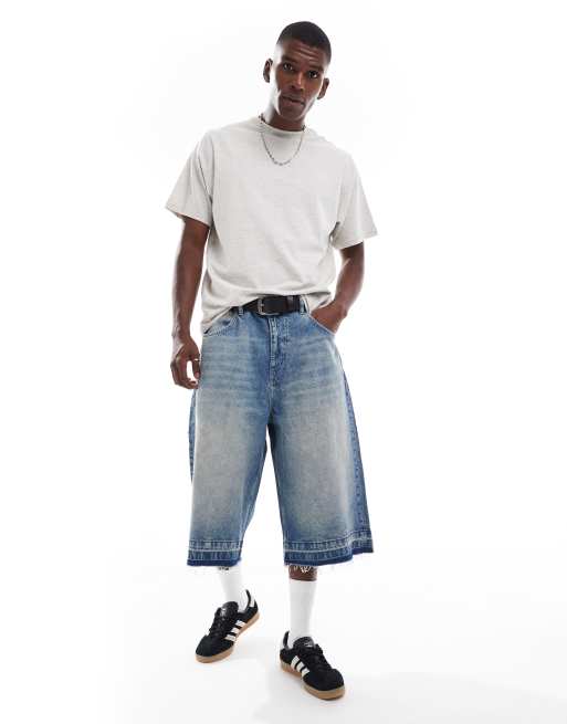 Pull&Bear – Super-Baggy-Jorts in Mittelblau mit offenem Saum