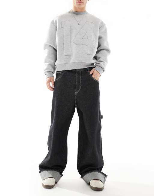 Pull&Bear – Superweite Jeans in Schwarz mit umgeschlagenem Saum
