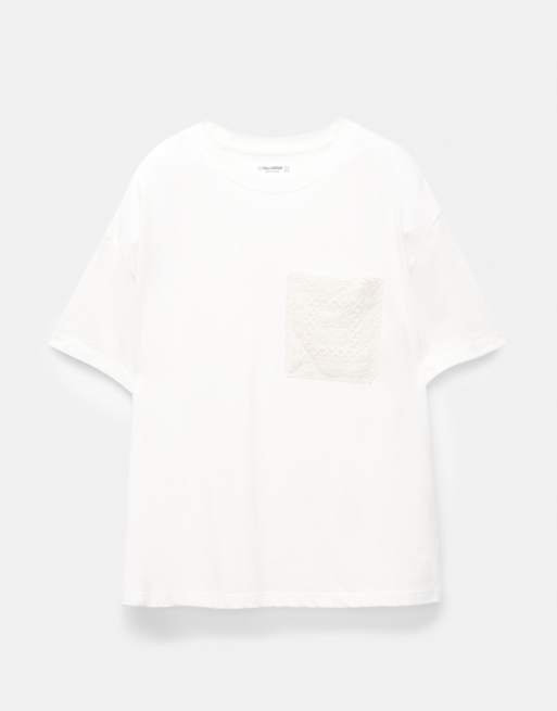 Pull&Bear – T-Shirt in Eisweiß mit gehäkelter Tasche