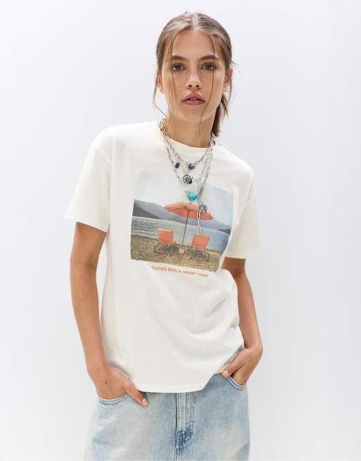 Pull&Bear – T-Shirt in Eisweiß mit Strand-Print