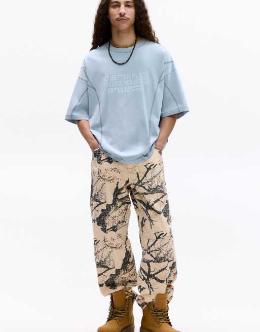 Pull&Bear – T-Shirt in Hellblau mit Nähten und Slogan
