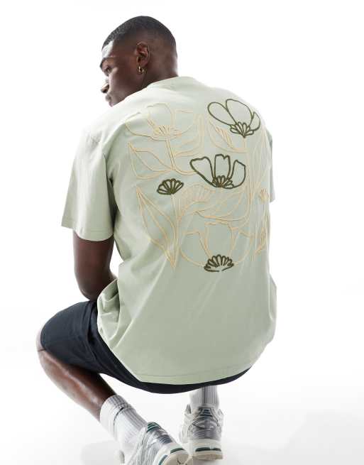 Pull&Bear – T-Shirt in Salbeigrün mit floraler Grafik am Rücken