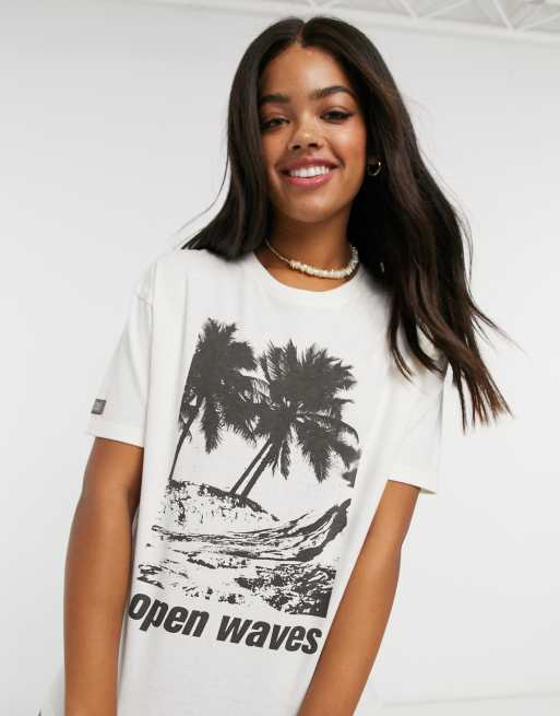 Pull&Bear – T-Shirt mit Palmenmotiv in Weiß
