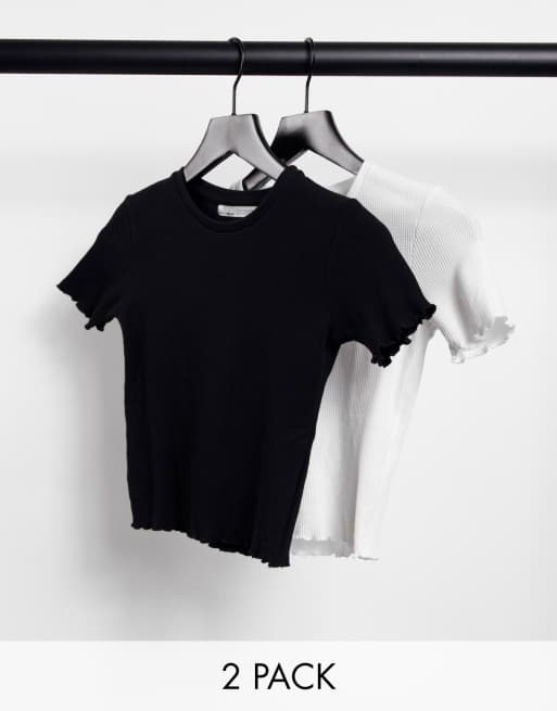 Pull&Bear – T-Shirts mit kurzem Schnitt und gekräuselter Kante in Schwarz und Weiß im 2er-Pack