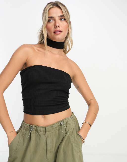 Pull&Bear – Trägerloses Oberteil in Schwarz mit Halsband-Detail