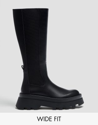 Pull&Bear Wide Fit – Kniehohe, flache Stiefel in Schwarz mit dicker Sohle