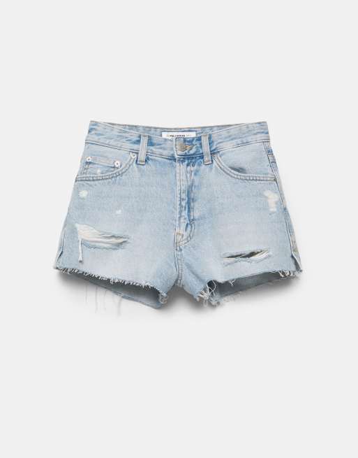 Pull&Bear – Zerrissene Mom-Jeansshorts in Blassblau