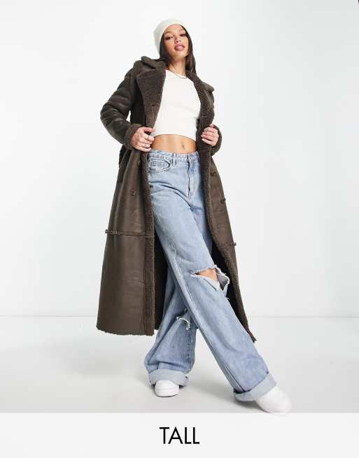 QED London Tall – Longline-Mantel aus Wildlederimitat in Schokoladenbraun mit Gürtel und Teddyfell-Besatz