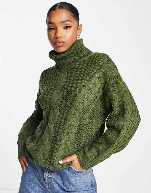 QED London – Oversize-Strickpullover in Khaki mit Rollkragen und Zopfmuster