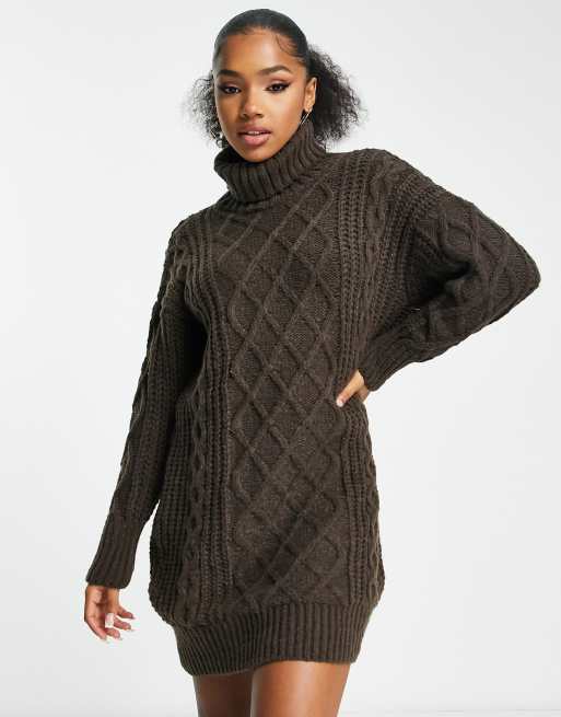 QED London – Pulloverkleid aus Strick mit Rollkragen und Zopfmuster in Schokoladenbraun