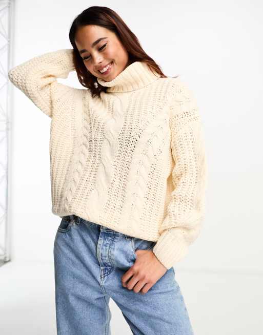 QED London – Strickpullover in Stein mit übergroßem Rollkragen und Zopfmuster