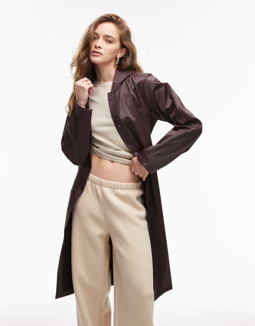 Rains – 12020 – Wasserdichte, längere Jacke in Kastanienbraun mit Bindegürtel und A-Linien-Schnitt